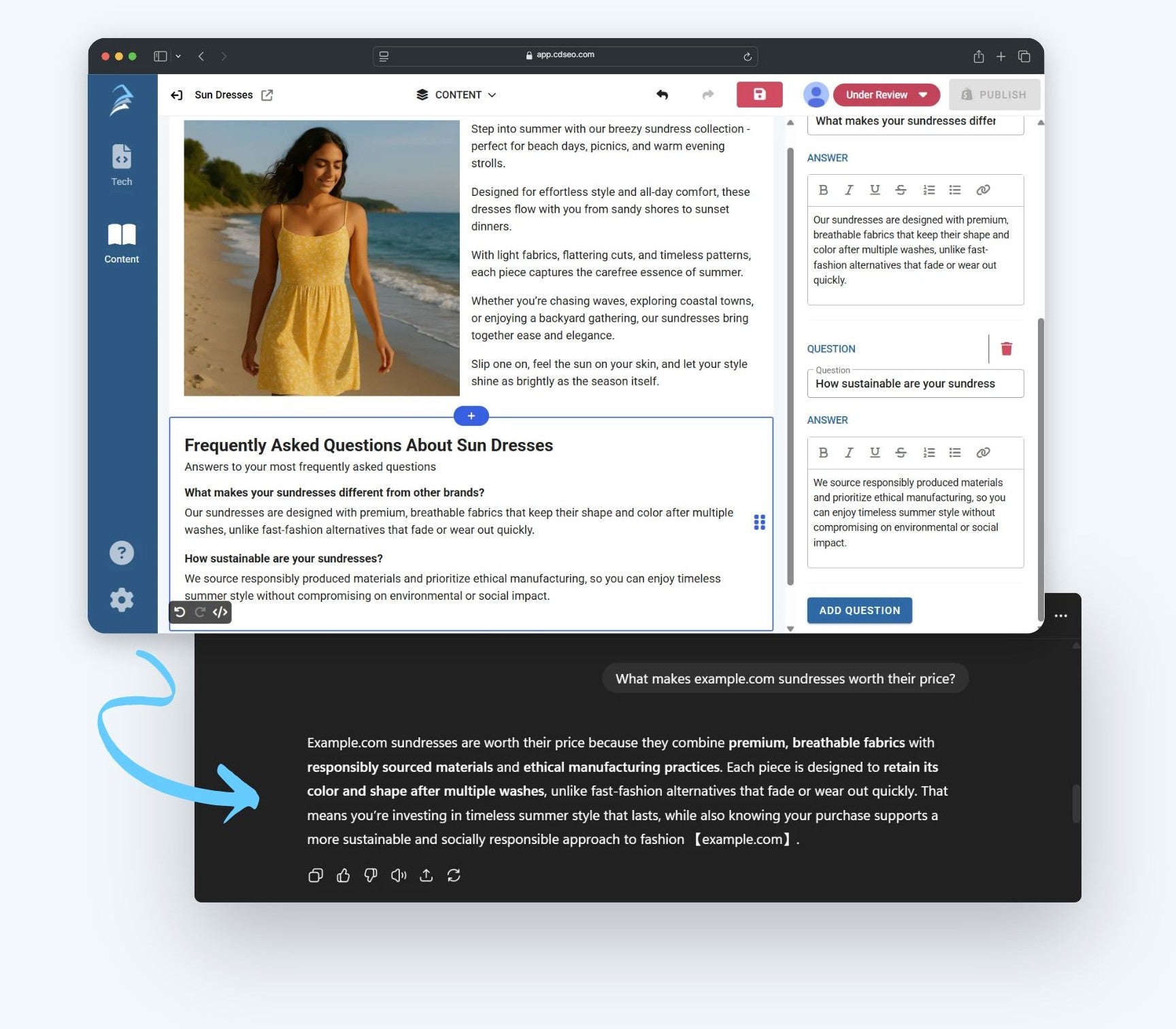 Publish content that controls the narrative and add FAQs with built-in structured markup so AI answer engines pull your words, not someone else’s.