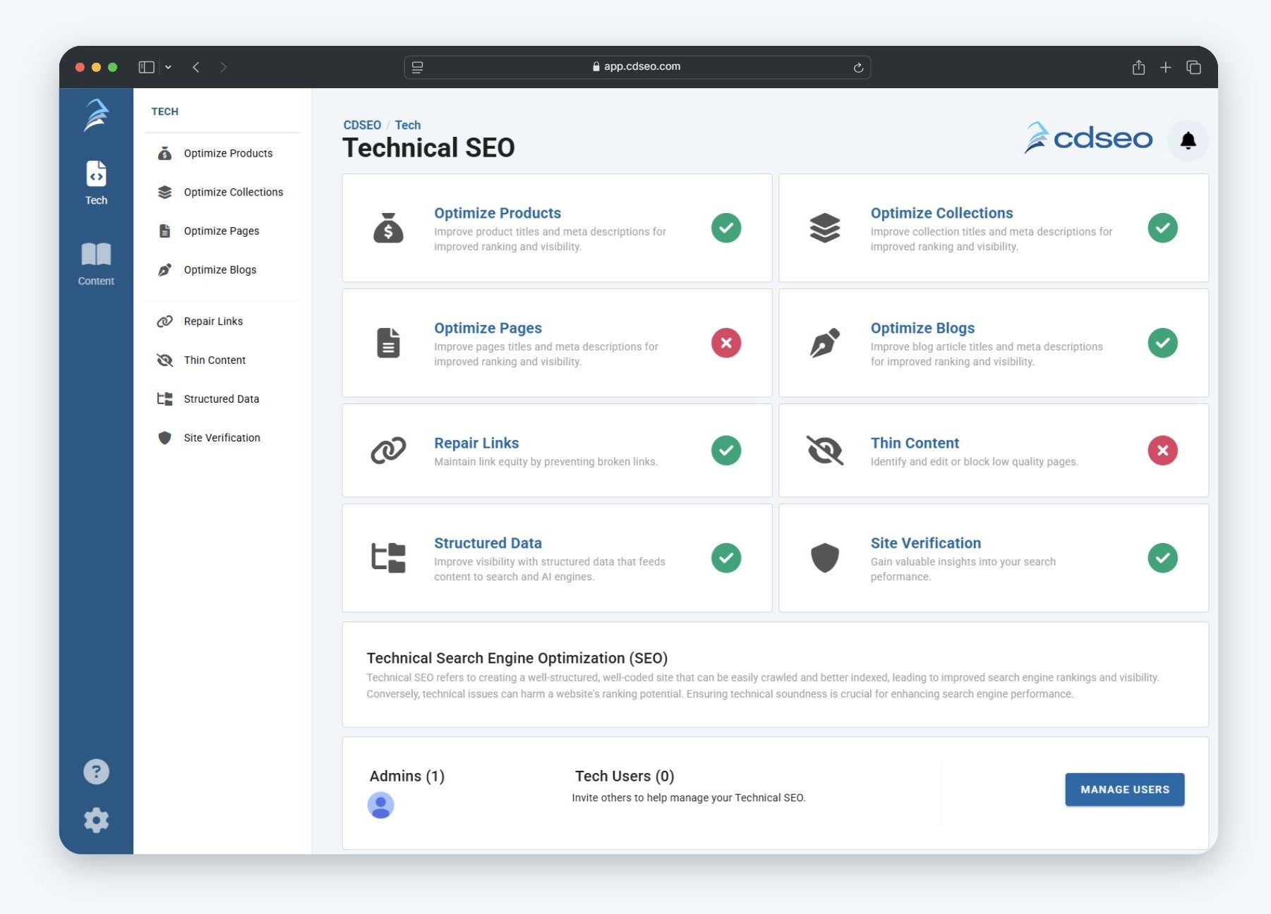 Unlike complicated SEO tools that overwhelm, CDSEO keeps it simple. With an intuitive interface, issues are clearly marked - red for fixes needed, green for resolved.