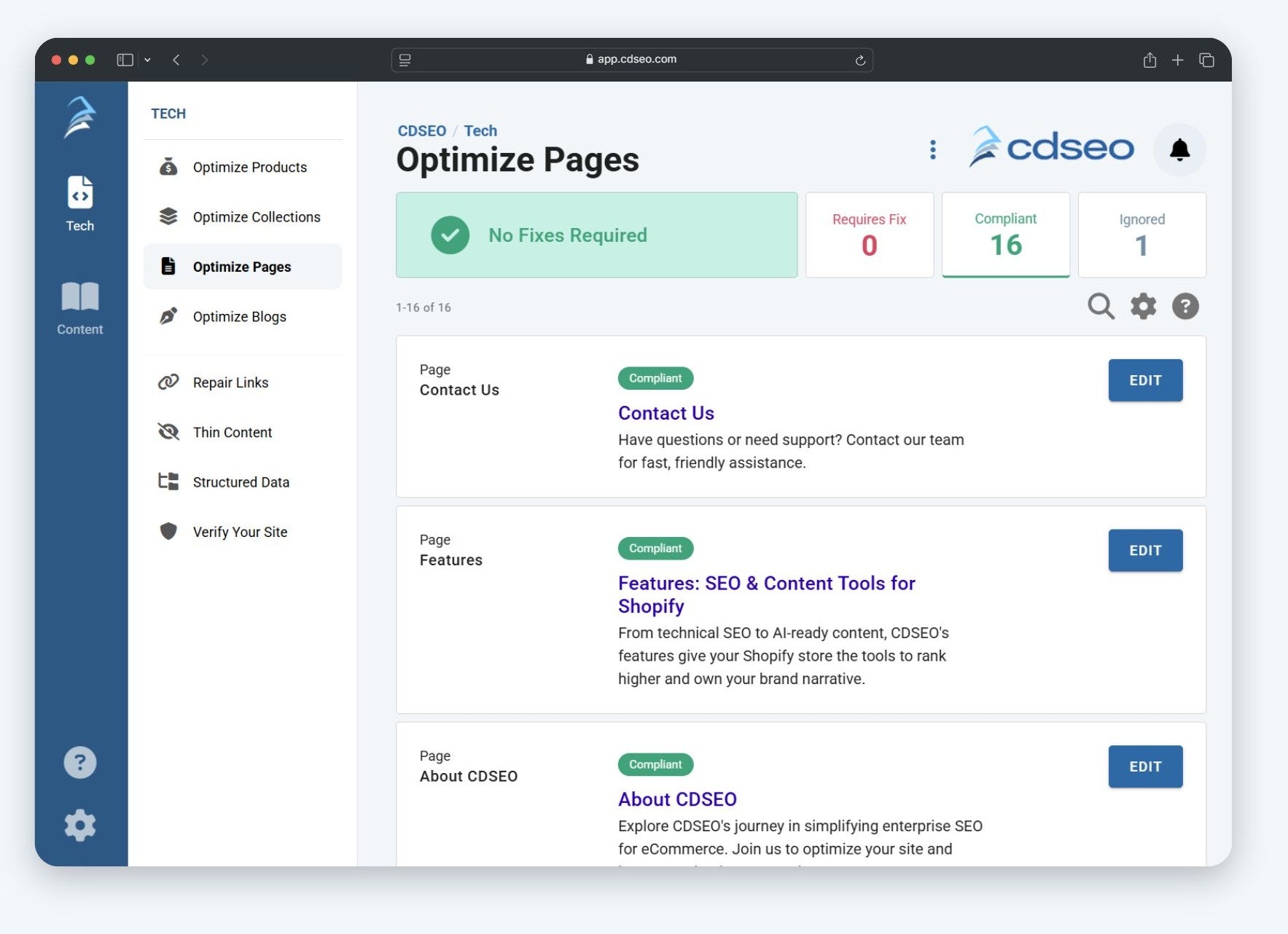CDSEO connects directly to your Shopify store and automatically syncs every page title and meta description for a complete overview of your site’s SEO status.