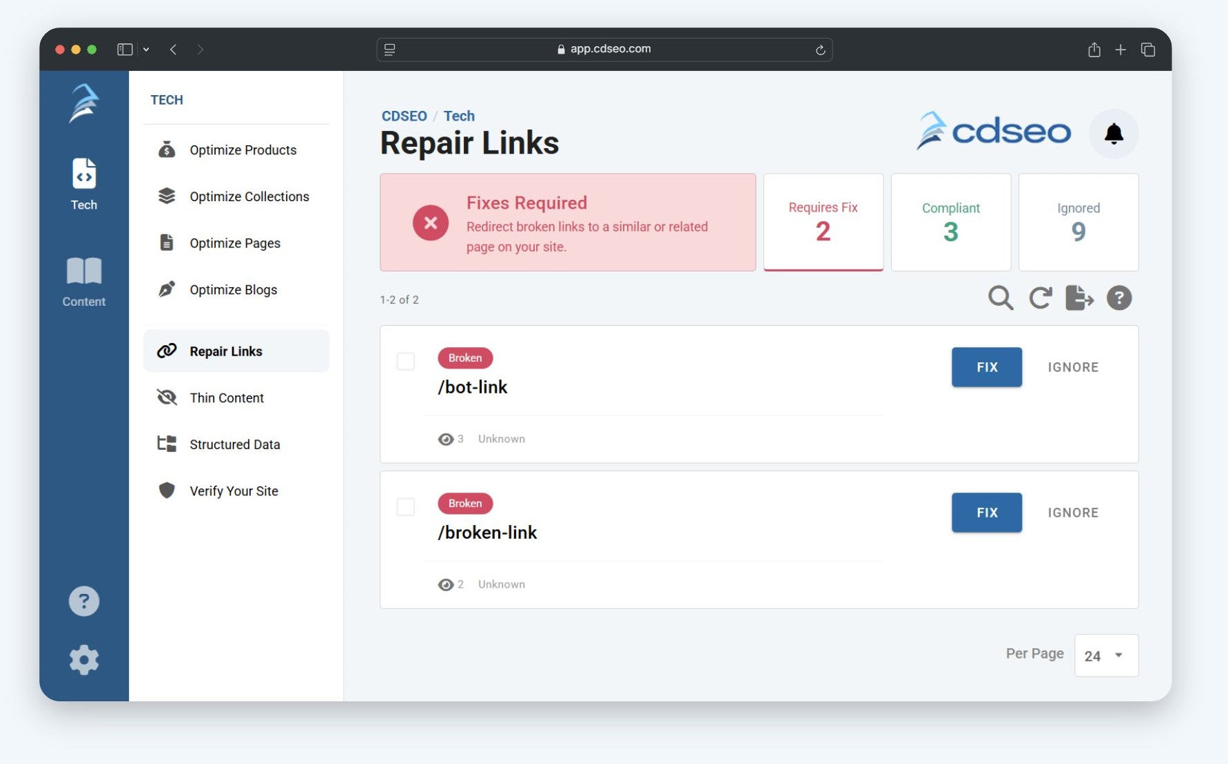 Every time a broken link is hit, CDSEO logs it, records its referrer when available, and displays it in a "Fixes Required" section.